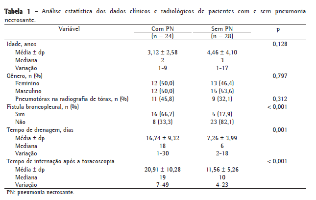 Em casos graves de PN, a ressecção pulmonar pode ser necessária. Antes de se realizar a ressecção pulmonar, a toracoscopia é usada para realizar os procedimentos preliminares (fenestração e limpeza mecânica local) para que os pacientes possam se recuperar da doença infecciosa.(7) Nenhum dos pacientes no presente estudo necessitou de toracotomia, um achado que corrobora os dados encontrados na literatura sobre toracoscopia para PN.(22)