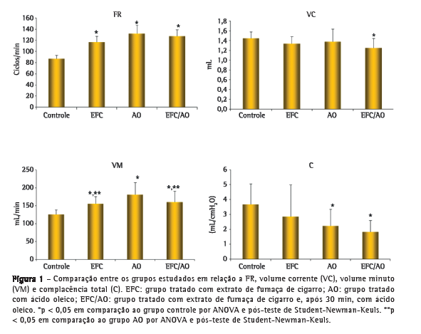 A média de peso dos animais não diferiu entre os grupos (controle: 233,0 ± 7,3 g; EFC: 242,7 ± 6,9 g; AO: 244,0 ± 6,8 g; e EFC/AO: 242,6 ± 8,2 g). No tocante à função respiratória, os valores médios da FR e do volume minuto (VM) dos grupos EFC, AO e EFC/AO foram significativamente maiores do que as do grupo controle (Figura 1). Já o VM do grupo AO também foi significantemente superior aos dos grupos EFC e EFC/AO. Os grupos EFC e EFC/AO também exibiram valores significantemente menores da complacência total em relação ao grupo controle.