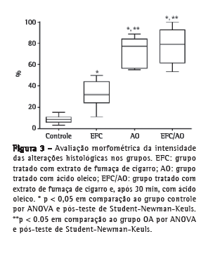 A análise histológica subjetiva, realizada por um especialista em patologia pulmonar cegado para os tipos de tratamento empregados, revelou alterações inflamatórias intensas nos pulmões dos animais tratados com AO. As lesões encontradas foram edema pulmonar acentuado, áreas de necrose e infiltração leucocitária dos septos, em especial de células polimorfonucleares. As alterações histológicas secundárias ao uso de EFC foram apenas tênues, com discreto espessamento septal e infiltração linfocitária. A análise morfométrica confirmou que a proporção de acometimento patológico foi máxima e de grau comparável entre os grupos tratados com AO. Por outro lado, a extensão das lesões provocadas pelo uso de EFC isoladamente foi intermediária entre esses grupos e o controle. Em conjunto, os resultados confirmam que o AO constitui um agente extremamente tóxico para os pulmões,(19,25) e o pré-tratamento com EFC i.v. em dose única não parece influenciar substancialmente o estabelecimento desse processo. Tais resultados apontam na mesma direção da interpretação obtida pela observação dos dados de complacência.