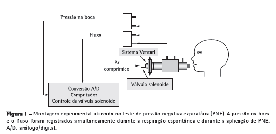 Durante o teste, a PNE é gerada por um dispositivo Venturi circular (AeroMech Devices; Almonte, ON, Canadá) acoplado a um tanque de ar comprimido. O dispositivo Venturi inclui uma válvula solenoide. A válvula solenoide tem um tempo de abertura de 50 ms; ela é ativada automaticamente no início da expiração e permanece aberta por 2 s sob controle do software (DirecWin versão 2.18a; Raytech Instruments Inc., Vancouver, BC, Canadá). Um pneumotacógrafo (modelo 3830; Hans Rudolph, Kansas City, MO, EUA) é conectado ao bocal. Conforme mostra a Figura 1, o fluxo e a pressão na boca também são medidos (DirecNEP modelo 200A; Raytech Instruments Inc.). Um valor de PNE de 10 cmH2O foi avaliado ocluindo-se o bocal com uma rolha e ajustando-se o fluxo de ar comprimido.