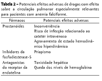 Não existe evidência de alta qualidade ou de seguimento longo avaliando terapias específicas para hipertensão arterial pulmonar em pacientes com anemia falciforme. A escolha de fármacos, no momento, é empírica e baseada no perfil de efeitos adversos e na preferência do profissional de saúde. Existem, entretanto, efeitos específicos dos diferentes fármacos que podem interagir de forma negativa com aspectos fisiopatológicos da anemia falciforme (Tabela 2).