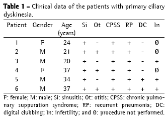 A total of six cases of PCD were found, five of which were cases of complete KS and one of which was a case of incomplete KS. Of the six patients studied, four were male and two were female. The mean age was 32.5 years (range, 20-37 years). All patients had a history of chronic respiratory tract infections, of the upper and lower respiratory tract (chronic sinus diseases and recurrent pneumonia, respectively). Chronic otitis was also a common manifestation. The male patients reported abundant mucopurulent expectoration, sometimes accompanied by hemoptysis, with chronic evolution. The two female patients, in whom the expectoration was not so intense, reported having had 'bronchitis' since childhood. (Note: In Brazil, asthma and asthma-like symptoms are commonly referred to as 'bronchitis'.) There were two siblings (Cases 5 and 6) who also presented digital clubbing. Table 1 shows the clinical data of the patients.