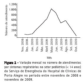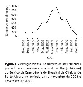 Foram incluídos no estudo crianças e adultos que se apresentassem na emergência com pelo menos um sintoma respiratório. No período do estudo (entre novembro de 2008 e novembro de 2009), foi revisado diariamente o número total de atendimentos no setor de adultos e de pediatria da emergência do HCPA. Os prontuários eletrônicos foram revisados e foram registradas as seguintes características dos pacientes atendidos por sintomas respiratórios: sexo, idade, cor, história tabágica, comorbidades, sintomas respiratórios e sintomas de gripe na família. Os sintomas respiratórios considerados foram coriza, congestão nasal, odinofagia, disfonia, tosse, falta de ar, sibilância, dor torácica e febre. Os pacientes que apresentavam apenas febre não foram incluídos no estudo. Também foram registrados os achados clínicos na admissão (temperatura axilar, FC, FR, achados na ausculta pulmonar e SpO2 por oximetria de pulso digital), as principais síndromes clínicas diagnosticadas e os desfechos dos pacientes (internação em UTI, internação em enfermaria, alta do serviço de emergência e óbito).