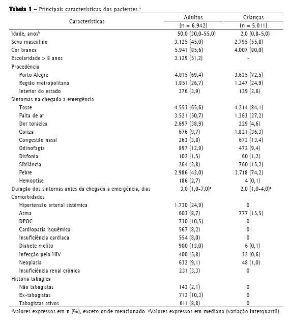 Durante o período de 12 meses do estudo, houve 37.059 admissões na emergência (24.189 adultos e 12.870 crianças), das quais 11.953 (32,3%) foram motivadas por sintomas respiratórios. A variação mensal no número de atendimentos por sintomas respiratórios na emergência é demonstrada nas Figuras 1 e 2. Observa-se um aumento no número de consultas na emergência durante os meses de abril a junho. A prevalência de atendimentos por sintomas respiratórios foi 28,7% (6.942/24.189) entre os pacientes adultos e 38,9% (5.011/12.870) entre os pediátricos. Os sintomas mais comuns foram tosse (73,4%), febre (56,1%), falta de ar (40,9%), dor torácica (24,5%) e coriza (20,9%). A mediana da duração dos sintomas antes da admissão foi de 3 dias (variação interquartil: 1-6 dias). Um total de 2.205 pacientes (18,5%) admitidos na emergência necessitou hospitalização; desses pacientes, 242 (2,0%) necessitaram de internação em UTI. A taxa de mortalidade global entre todos os participantes do estudo foi 2,3% (280/11.953). As características demográficas e clínicas da população do estudo (adultos e crianças) são mostradas na Tabela 1.