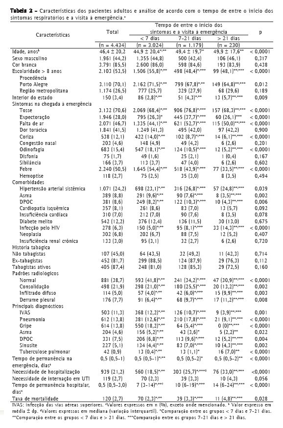 A Tabela 2 mostra as características dos pacientes adultos e sua análise de acordo com o tempo de início dos sintomas antes da chegada na emergência. O tempo entre o início dos sintomas e a visita à emergência não estava disponível para todo o grupo de pacientes; portanto, nessa análise, foram incluídos apenas 4.434 pacientes. As taxas de internação hospitalar e de mortalidade para os adultos foram de 21,2% (939/4.434) e 2,7% (120/4.434), respectivamente. As medianas (variação interquartil) do tempo de permanência na emergência e do tempo total de hospitalização foram 0,5 dia (0,5-1,0 dia) e 0,5 dia (0,5-3,0 dias), respectivamente. Os pacientes que apresentavam sintomas há menos de 7 dias (grupo <7) tinham menor idade do que os pacientes com tempo de início de sintomas de 7-21 dias (grupo 7-21) e > 21 dias (grupo >21; 44,9 ± 20,4 anos vs. 49,4 ± 19,7 anos e 49,9 ± 17,6 anos; p < 0,0001). Quanto maior o tempo entre o início dos sintomas e a visita à emergência, menor a escolaridade dos pacientes (p < 0,0001). Já a proporção de pacientes provenientes do município de Porto Alegre foi maior quanto menor foi o tempo do início de sintomas (p = 0,012). Com relação aos sintomas respiratórios, coriza, odinofagia e febre foram mais comuns nos pacientes do grupo <7. Já tosse e falta de ar foram mais frequentes naqueles do grupo 7-21. O número de pacientes asmáticos foi maior no grupo <7 (p = 0,002), e o número de pacientes com infecção pelo HIV foi maior no grupo >21 (p < 0,0001). Entre os pacientes que realizaram radiografia de tórax, resultados normais foram mais frequentes nos pacientes do grupo <7 (p < 0,0001), e o padrão consolidativo foi mais comum nos pacientes do grupo 7-21 (p = 0,002). Derrame pleural e infiltrado difuso foram mais presentes no grupo >21 (p = 0,008 e p = 0,003, respectivamente). Os diagnósticos mais frequentes no grupo <7 foram gripe, em 18,2%; pneumonia, em 12,6%; e infecção de vias aéreas superiores (IVAS), em 12,2%. No grupo 7-21, esses foram pneumonia, em 17,8%; IVAS, em 10,7%; e exacerbação de DPOC, em 9,6%; enquanto, no grupo >21, esses foram pneumonia, em 9,1%; exacerbação de DPOC, em 5,2%; e sinusite, em 4,3%. O tempo de permanência na emergência foi menor nos pacientes do grupo <7 (p < 0,0001). Quanto maior o tempo entre o início dos sintomas e a visita à emergência, maior a necessidade de hospitalização (p < 0,0001), maior o tempo de hospitalização (p < 0,0001) e maior a mortalidade (p = 0,028).
