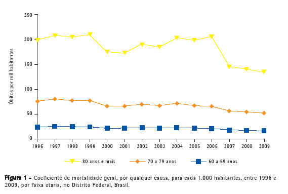 As estimativas sobre a população idosa residente no DF, por idade, foram obtidas do Instituto Brasileiro de Geografia e Estatística.(12) Em países em desenvolvimento, a Organização das Nações Unidas considera como idoso o indivíduo com idade igual ou superior a 60 anos. No Brasil, a Lei nº 8.842/9 adota essa mesma faixa etária como o início da velhice. Para o presente estudo, os idosos foram classificados em três grupos etários: 60 a 69 anos, 70 a 79 anos e 80 anos ou mais.