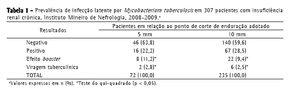 A prevalência da ILMT (TT1 positivo), quando considerada a enduração ≥ 10 mm (pacientes com IRC e não candidatos a transplante) foi de 28,5%, com incremento de 9,4% no TT2 (fenômeno booster) e de 2,5% para o TT3 (viragem tuberculínica).