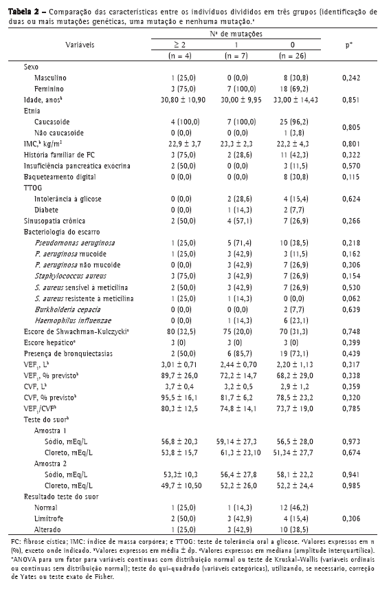 A Tabela 2 compara as características entre os indivíduos com duas ou mais mutações identificadas, aqueles com apenas uma e aqueles com nenhuma. Não houve diferenças significativas entre os grupos com relação ao sexo, idade, etnia e história familiar de FC. A presença de insuficiência pancreática exócrina não diferiu estatisticamente entre os três grupos (em 2, zero e 3 pacientes, respectivamente). O achado de baqueteamento digital, IMC, presença de diabete melito e presença de sinusopatia crônica também não diferiram entre os grupos. Em relação à avaliação microbiológica do escarro, não foram identificadas diferenças significativas entre os grupos em relação à identificação de P. aeruginosa, S. aureus, H. influenzae e B. cepacia. Não houve diferenças significativas entre os grupos para o escore clínico de Shwachman-Kulczycki, escore hepático de Williams e presença de bronquiectasias. Tampouco foram encontradas diferenças estatisticamente significativas entre os três grupos em relação às médias de CVF e VEF1, em % do previsto, e da relação VEF1/CVF. As dosagens de sódio e de cloretos no suor não diferiram entre os grupos. Os resultados do teste do suor, classificados como normal, limítrofe ou alterado, não diferiram entre os três grupos. Esses resultados foram observados, respectivamente, em 1, 2 e 1 pacientes no grupo com pelo menos duas mutações identificadas; em 1, 3 e 3 pacientes no grupo com uma mutação; e em 12, 4 e 10 pacientes no grupo sem mutação identificada.