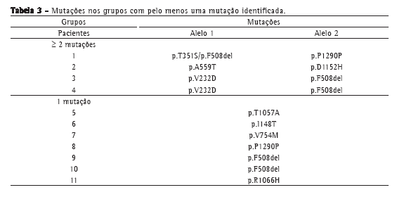 As mutações identificadas na análise molecular estão descritas na Tabela 3. A mutação p.F508del foi a mais comum, encontrada em 5 pacientes. A associação das mutações p.V232D e p.F508del foi encontrada em 2 pacientes. Foram identificadas três mutações em um mesmo paciente (p.T351S, p.F508del no primeiro alelo e p.P1290P no segundo alelo). Outras mutações encontradas foram as seguintes: p.A559T, p.D1152H, p.T1057A, p.I148T, p.V754M, p.P1290P e p.R1066H.