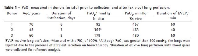 These three cases represent our initial experience, which was encouraging. After appropriate training, it is not difficult to perform EVLP, and the difference found in the blood gas analysis results indicates a significant improvement in the gas exchange capacity of the organs assessed. We will continue our studies of EVLP in order to gain a better understanding, through assessment of pathological anatomy, of how EVLP affects the lung tissue, so that it can soon be applied in clinical practice.