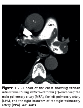 A 63-year-old man presented to the Pablo Tobon Uribe Hospital, in Medellin, Colombia, complaining of dyspnea in the preceding two weeks. Physical examination revealed tachycardia, tachypnea, mild hypertension, jugular venous distention, abdominal distention, and edema in the lower limbs. However, cardiac and pulmonary findings were unremarkable. An electrocardiogram revealed only sinus tachycardia. The cardiac troponin I level was 0.2 ng/mL (normal, < 0.04 ng/mL), and the N-terminal pro-brain natriuretic peptide level was 3,590 pg/mL (normal, < 125 pg/mL). Subsequent helical CT scans of the chest confirmed PE by showing filling defects involving the main pulmonary artery and its primary branches (Figure 1). A venous ultrasound revealed left iliofemoral deep vein thrombosis. Intravenous heparin was started.