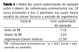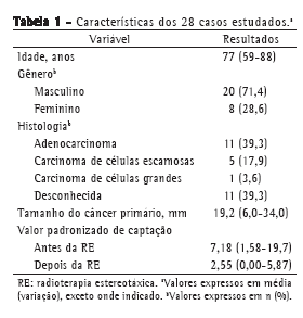 Analisamos retrospectivamente os casos de todos os pacientes submetidos a RE para tratamento de câncer de pulmão no Kameda Medical Center, em Kamogawa, Japão, entre abril de 2005 e março de 2011. As características dos pacientes são apresentadas na Tabela 1. Houve um total de 28 pacientes (20 homens e 8 mulheres). A mediana da idade foi de 77 anos (variação: 59-88 anos). Todos os pacientes foram classificados em portadores de câncer de pulmão estágio IA. Ao compararmos os valores pré-RE e pós-RE, constatamos que houve uma diminuição significativa do SUV para a lesão primária (8,0 vs. 2,2; p < 0,001). Durante o período de seguimento, 2 dos pacientes apresentaram recidiva, evidenciada pela descoberta de que seus SUVs haviam aumentado significativamente em relação aos valores obtidos no período imediatamente após a RE (Tabela 2). Nesses 2 pacientes, houve confirmação clínica e anatomopatológica posterior da recidiva do câncer de pulmão.