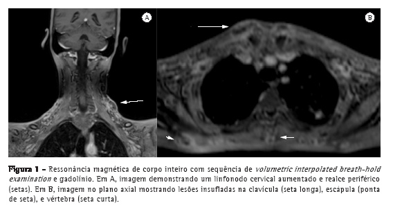 Antes do início do tratamento necessário, obtivemos a assinatura de um termo de consentimento livre e esclarecido e o paciente foi submetido a RM de corpo inteiro a fim de investigar minuciosamente o envolvimento sistêmico da doença disseminada. O exame revelou extenso envolvimento em múltiplos locais em todo o corpo, incluindo o tecido subcutâneo, linfonodos, sistema esquelético, cavidade pleural, e cavidade peritoneal. A RM de corpo inteiro também revelou linfonodomegalia em múltiplas cadeias ganglionares. Em uma sequência de volumetric interpolated breath-hold examination (VIBE) com gadolínio, os linfonodos apresentaram realce periférico (Figura 1A). Em uma sequência short-tau inversion-recovery (STIR), as porções centrais desses linfonodos exibiram sinais hiperintensos, dando-lhes uma aparência necrótica.