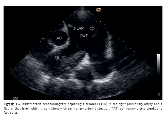 A 50-year-old male patient diagnosed four years prior with pulmonary hypertension related to schistosomiasis mansoni was admitted to the emergency room of the Federal University of Minas Gerais School of Medicine Hospital das Clínicas, located in the city of Belo Horizonte, Brazil. He presented with new onset, progressively worsening retrosternal chest pain and shortness of breath (functional class III pulmonary hypertension according to the World Health Organization). He had been diagnosed with chronic myeloid leukemia seven months prior and had since been on chemotherapy. At admission, transthoracic echocardiography revealed a large non-obstructive central thrombus in the right main pulmonary artery. The right atrium was dilated, and there was mild tricuspid regurgitation, with an estimated pulmonary artery systolic pressure of 63 mmHg. He was diagnosed as having in situ thrombosis as a complication of the long-standing pulmonary hypertension. After the possibility of acute coronary syndrome had been excluded, he was discharged on warfarin. He was re-admitted two months later due to progressively worsening, refractory chest pain. At that time, he had an SpO2 of 96%, and a third heart sound was audible at the lower left parasternal space, accompanied by a murmur of tricuspid regurgitation. The lungs were clear, and the peripheral arterial pulses were symmetric. Laboratory test results were unremarkable, including serum levels of creatine kinase, creatine kinase MB isoenzyme, and troponin. A resting electrocardiogram showed evidence of acute myocardial ischemia in the anterior leads. Transthoracic Doppler echocardiogram revealed a pulmonary artery systolic pressure of 62 mmHg, a thrombus in the right pulmonary artery, as in the previous examination, and the presence of a flap at that level that was compatible with pulmonary artery dissection (Figure 1). The diagnosis was confirmed by subsequent CT pulmonary angiography (CTPA; Figure 2). He was transferred to another cardiovascular treatment facility, where attempts were made to correct the defect with an endovascular procedure (via the femoral vein). During the perioperative period, the patient presented with refractory cardiogenic shock. Multiple efforts to resuscitate the patient were unsuccessful, and he died in the operating room.