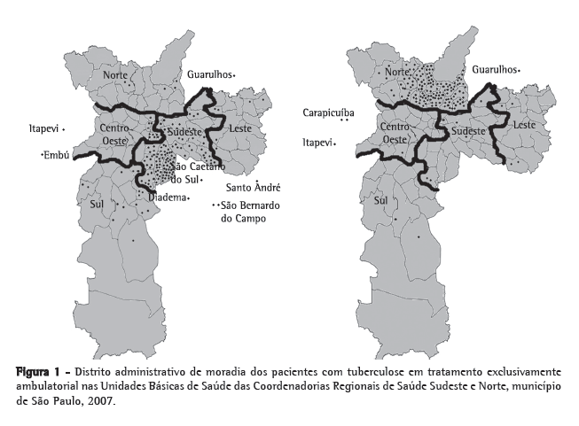 O objetivo deste estudo foi avaliar o acesso aos serviços de saúde, pois esse é um fator importante para o diagnóstico e o tratamento dos casos de TB. Para tanto, realizamos o mapeamento dos locais de moradia e dos locais de tratamento ambulatorial de TB (após a alta hospitalar) de pacientes internados em dois hospitais de grande porte do município, comparando esses dados com os de pacientes com TB submetidos somente ao tratamento ambulatorial.