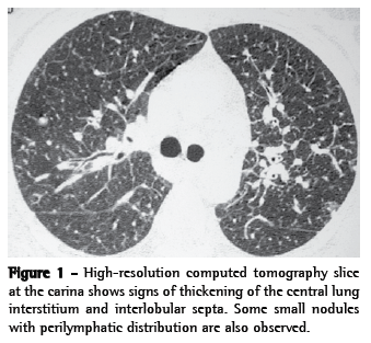 Clinically, there can be dry cough, dyspnea and wheezing, with rapid evolution of symptoms. Tomography scans of the chest reveal thickening of the interlobular septa and bronchovascular cuffs, together with nodules distributed throughout the lymphatic vessels, corresponding, histologically, to the infiltration of internal neoplastic cells. The pulmonary architecture is preserved, with no evidence of lung parenchyma remodeling.(3) Pulmonary function tests are useful in making the differential diagnosis and usually show mixed respiratory disorder without diffusional alteration, as well as hypoxemia at rest, without hypercapnia. The diagnosis is typically based on specimens from a transbronchial biopsy or bronchoalveolar lavage.(4)