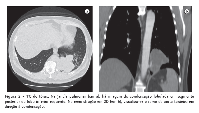 Ao exame, apresentava-se em bom estado geral, afebril, hemodinamicamente estável, com FC = 88 bpm e pressão arterial de 90-145 mmHg. A ausculta cardíaca era normal, e o exame pulmonar revelava expansibilidade e murmúrio vesicular diminuídos no terço inferior do hemitórax esquerdo, assim como macicez na percussão nesta região torácica. O restante do exame físico não revelava nenhuma anormalidade. Os exames laboratoriais de admissão, como hemograma, lipidograma, coagulograma, eletrólitos, função renal e hepática, eram normais. A VHS era de 32 mm/h. A sorologia para HIV foi negativa. A radiografia de tórax na internação demonstrava condensação no lobo inferior esquerdo no segmento posterior (Figura 1). Foi realizada TC do tórax com reconstrução em 2D, que demonstrava um ramo da aorta em direção à condensação pulmonar (Figura 2), compatível com o diagnóstico de sequestro pulmonar. O paciente foi encaminhado para cirurgia, tendo sido realizada lobectomia inferior esquerda para a ressecção do tecido pulmonar anômalo (Figura 3). Após a análise macroscópica da peça, caracterizou-se o sequestro intralobar. O paciente apresentou boa evolução pós-operatória, recebendo alta com acompanhamento ambulatorial.