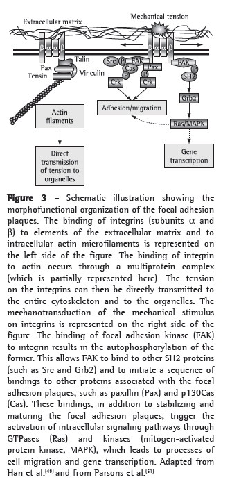 One of the most important signaling molecules is FAK.(51) A 125-kDa tyrosine kinase, FAK was initially identified in the focal adhesion plaques. It was subsequently demonstrated that, after the interaction between integrin and the extracellular matrix, FAK undergoes a coordinated sequence of events: it is autophosphorylated on tyrosine residues (especially Y397); it combines with other tyrosine kinases of the Src family (such as pp60src); it phosphorylates other proteins associated with the focal adhesion plaques, such as p130Cas and paxillin(52); and it binds to other SH2 proteins, such as Grb2 (in order to activate other signaling pathways, such as Ras and MAPK).(47) Therefore, the location of FAK in the focal adhesion plaque and the phosphorylation of this kinase are important initial events of the mechanotransduction mechanism and play an important role in the formation of new focal junctions.