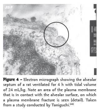 Webb and Tierney were the first authors to describe the pulmonary changes induced by mechanical ventilation with high tidal volume (VT).(8) They studied rats that were ventilated with a positive end-expiratory pressure of 0 cmH2O and a peak inspiratory pressure of 14, 30 or 45 cmH2O. Nonventilated control animals and those submitted to a peak inspiratory pressure of 14 cmH2O presented no pathological changes in the lung. Animals submitted to a peak inspiratory pressure of 30 cmH2O showed perivascular edema without alveolar edema, whereas those submitted to a peak inspiratory pressure of 45 cmH2O showed perivascular edema, alveolar edema, severe hypoxemia and reduced dynamic compliance and died one hour after the beginning of the experiment.(8)
