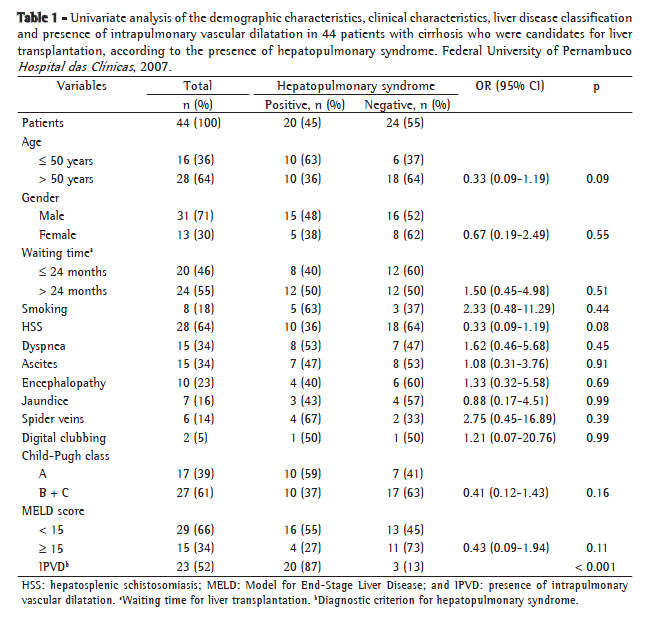 The objective of the present study was to determine the occurrence of HPS in candidates for liver transplantation; to compare demographic, clinical, and laboratory characteristics, as well as echocardiography results, spirometry results, arterial blood gas analysis, and severity of liver disease (Child-Pugh class and Model for End-Stage Liver Disease [MELD] score) between the groups of patients with and without HPS; and to describe the occurrence of HPS in the subgroup of patients with MLD.