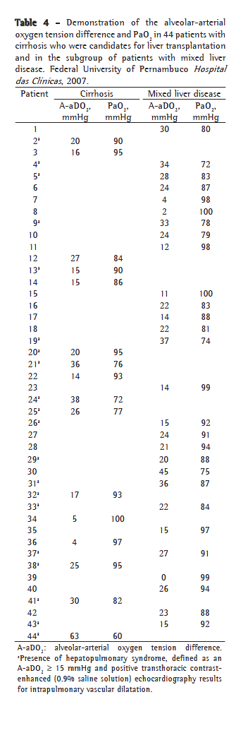 In summary, the frequency of HPS in the liver transplant candidates analyzed in the present study was high, even when different A-aDO2 cut-off points were used. In addition, we found no association between the occurrence of HPS and the variables analyzed. Studies involving larger numbers of patients with cirrhosis, HSS (without cirrhosis), and MLD could confirm these findings.