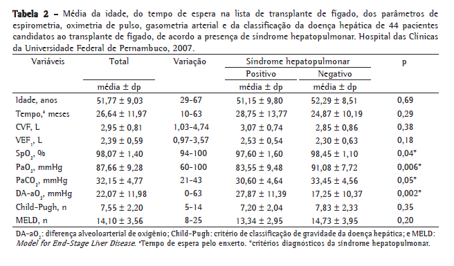 Objetivo: Verificar a ocorrência da síndrome hepatopulmonar (SHP) em pacientes cirróticos candidatos a transplante de fígado; comparar as características demográficas, clínicas, laboratoriais e espirométricas, resultados de ecocardiografia, análise de gases arteriais e da gravidade da doença hepática nos pacientes com e sem SHP; e descrever a ocorrência de SHP no subgrupo de pacientes com cirrose associada à esquistossomose mansônica (doença hepática mista). Métodos: Entre janeiro e novembro de 2007, foram avaliados 44 pacientes inscritos no Ambulatório de Transplante Hepático do Hospital das Clínicas da Universidade Federal de Pernambuco, em Recife (PE). Os critérios diagnósticos para SHP foram a presença de dilatações vasculares intrapulmonares, identificadas por ecocardiografia transtorácica, assim como diferença alveoloarterial de oxigênio ≥ 15 mmHg ou PaO2 < 80 mmHg. Resultados: A idade média foi 52 anos, e 31 pacientes (70%) eram do sexo masculino. A causa mais frequente de cirrose foi uso de etanol. A esquistossomose esteve presente em 28 pacientes (64%). Dos 44 pacientes, 20 (45,5%) foram diagnosticados com SHP. Não foram observadas diferenças significativas em relação às características estudadas. No subgrupo de pacientes com cirrose associada à esquistossomose, 10/28 (35,7%) receberam o diagnóstico de SHP. Conclusões: A SHP apresentou elevada prevalência nesta população estudada, não sendo observadas associações entre a sua ocorrência e as variáveis analisadas.