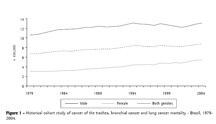 Results Between 1979 and 2004, 287,484 deaths resulting from cancer of the trachea, bronchial cancer and lung cancer were registered in Brazil, of which 207,457 occurred in men and 80,027 in women. In 1979, the ratio of deaths by gender was 1 death among women for every 3.3 deaths among men. However, in 2004 that ratio was lower and reached 1:2. The deaths resulting from this type of cancer were responsible for approximately 12% of the cancer-related mortality in the country during the period of study.