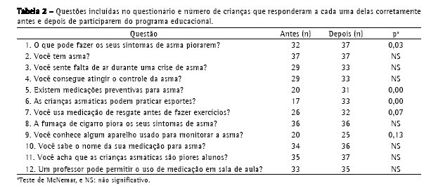 A Tabela 2 ilustra as respostas referentes ao conhecimento sobre a asma antes e após a intervenção. Todos os participantes espontaneamente admitiam ter asma antes de participarem do programa. Mais de 90% de todas as crianças já haviam respondido a quatro questões corretamente antes de o programa educacional ser completado: questões 3 e 8 (sobre sintomas), questão 10 (sobre medicação) e questão 11 (sobre conceitos errôneos).