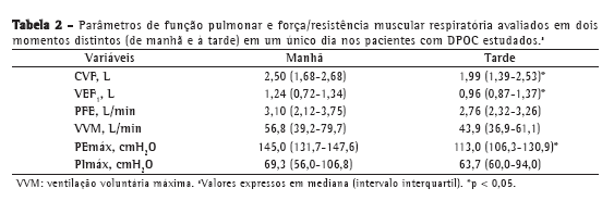 Um pequeno número de estudos investigou o padrão de flutuações diurnas na função pulmonar em indivíduos saudáveis. Com relação a pacientes com DPOC, falta conhecimento sobre as alterações diurnas na função pulmonar e na força muscular respiratória. O objetivo do presente estudo foi avaliar, em uma amostra de pacientes com DPOC, a magnitude de mudanças em parâmetros de função pulmonar e de força e resistência dos músculos respiratórios, avaliados em dois momentos em um único dia.