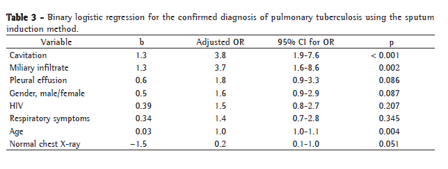 Table 3 displays the binary logistic regression for the confirmed diagnosis of pulmonary TB using IS. A diagnosis of pulmonary TB was significantly associated with the radiological findings of cavitation (OR = 3.8; 95% CI: 1.9-7.6) and miliary infiltrate (OR = 3.7; 95% CI: 1.6-8.6).