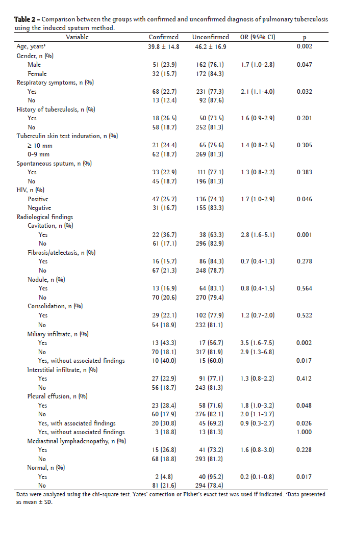 The comparison between the two groups (confirmed and unconfirmed diagnosis of pulmonary TB through IS sample testing) is shown in Table 2. Patients in the confirmed group were significantly younger than were those in the unconfirmed group (p = 0.002). Males predominated significantly in the confirmed group (p = 0.047). Positive IS results were significantly associated with the presence of respiratory symptoms (p = 0.032) and HIV positivity (p = 0.046). In addition, the following radiological findings were significantly associated with the diagnosis of pulmonary TB: cavitation (p = 0.001); miliary infiltrate (p = 0.0002); and pleural effusion (p = 0.048). The rate of confirmed diagnosis of pulmonary TB was significantly higher among the patients with the miliary infiltrate pattern, with or without other radiological findings, than among those without (p = 0,017). However, among those with pleural effusion in isolation, no significant association was found (p = 1.000).