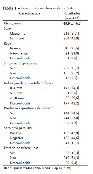 As características clínicas dos pacientes estão apresentadas na Tabela 1. Dos 417 pacientes estudados, 213 (51,1%) eram do sexo masculino. A idade média foi 49,9 ± 16,3 anos. A maioria dos pacientes eram de raça branca (75,5%) e tinham sintomas respiratórios (71,7%). Na PT, a induração foi de 0-4 mm em 143 pacientes (34,3%), 5-9 mm em 11 (2,6%) e ≥ 10 mm em 86 (20,6%). Amostras de escarro espontâneo foram coletadas de 144 pacientes com resultados prévios negativos para BAAR (34,5%). Em nossa amostra, 183 pacientes (43,9%) apresentaram resultados positivos para HIV, e 68 (16,3%) tinham história de TB.