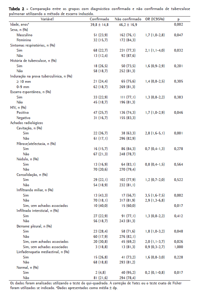Objetivo: Verificar a sensibilidade diagnóstica da análise bacteriológica do escarro induzido (EI) para o diagnóstico de tuberculose (TB) pulmonar e identificar as variáveis clínicas associadas com o diagnóstico confirmado. Além disso, avaliar o rendimento diagnóstico da broncoscopia realizada se a pesquisa de BAAR for negativa no EI. Métodos: Estudo transversal e retrospectivo de pacientes com suspeita de TB pulmonar ativa, encaminhados ao serviço para a indução de escarro. Foram revisados consecutivamente os registros laboratoriais de todos os pacientes submetidos à indução de escarro entre junho de 2003 e janeiro de 2006, assim como o prontuário eletrônico de cada caso. Também foram revisados os resultados bacteriológicos das amostras broncoscópicas coletadas dos pacientes cujos resultados de BAAR em EI foram negativos. Resultados: Dos 417 pacientes estudados, 83 (19,9%) tiveram resultados positivos (BAAR e/ou cultura) no EI. Na análise de regressão logística, os achados radiológicos de cavitação pulmonar (OR = 3,8; IC95%: 1,9-7,6) e de infiltrado de padrão miliar (OR = 3,7; IC95%: 1,6-8,6) associaram-se mais significativamente com o diagnóstico de TB pulmonar. A broncoscopia foi realizada, após resultado de BAAR negativo no EI, em 134 pacientes e acrescentou 25 (64,1%) diagnósticos confirmados de TB pulmonar. Conclusões: Na prática clínica, a frequência de diagnósticos confirmados de TB pulmonar por EI (19,9%) foi menor do que aquela previamente relatada em ensaios controlados. Cavitação e infiltrado miliar aumentam a probabilidade diagnóstica de TB pulmonar no EI. O uso de broncoscopia quando EI é negativo para BAAR melhora significativamente a sensibilidade para o diagnóstico de TB.