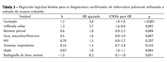 A Tabela 3 mostra a regressão logística binária para os diagnósticos confirmados de TB pulmonar usando EI. O diagnóstico de TB pulmonar associou-se significativamente aos achados radiológicos de cavitação (OR = 3,8; IC95%: 1,9-7,6) e infiltrado miliar (OR = 3,7; IC95%: 1,6-8,6).