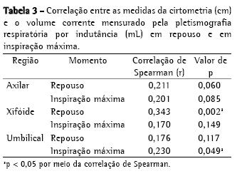 A Tabela 3 apresenta as correlações entre a cirtometria e a pletismografia baseadas nessas médias. Todas as correlações encontradas foram de baixa magnitude (variação de r = 0,170-0,343), sendo que as correlações dos resultados referentes à região xifóide em repouso e à região umbilical em inspiração máxima apresentaram-se significativas.