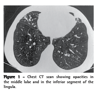 Because the productive cough persisted, the patient underwent chest CT, which revealed opacities in the middle lobe, the inferior segment of the lingula, and the anterior segment of the right upper lobe, as well as thickening of the peribronchial sheaths and signs of mucoid impaction (Figure 1). A second fiberoptic bronchoscopy revealed the persistence of a large quantity of diffuse yellowish mucus, and the microbiological analysis of the material revealed the growth of Staphylococcus aureus (50,000 CFU/mL). The patient underwent treatment with ciprofloxacin (500 mg, bid) for 21 days, after which she remained symptomatic.