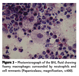 The diagnosis of lipoid pneumonia, when suspected, can be made based on the clinical history and on suggestive complementary test results. The approved diagnostic method for lipoid pneumonia is BAL, through which it is possible to detect the presence of foamy alveolar macrophages with lipid vacuoles stained with Sudan.(3) In the present case, we used Papanicolaou staining in order to reveal such macrophages (Figure 3). Oil ingestion is rarely reported at the time of the first consultation, and the case reported here is a prime example of that. In most cases, except when focused history taking is employed, patients are questioned regarding oil ingestion only after complementary test results indicative of lipoid pneumonia are