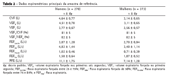 No Brasil, valores de referência para a espirometria na população adulta foram obtidos para a raça branca em 1992.(4) Os valores previstos para a curva volume-tempo foram obtidos através de um espirômetro de fole. Nos últimos anos, os espirômetros de fluxo tornaram-se altamente precisos e são atualmente os mais utilizados. Um novo parâmetro para detecção de obstrução do fluxo aéreo, a relação volume expiratório forçado no primeiro segundo/volume expiratório forçado nos primeiros seis segundos (VEF1/VEF6), foi sugerido nos últimos anos.(5) Valores de referência para essa relação em nossa população não estão disponíveis.