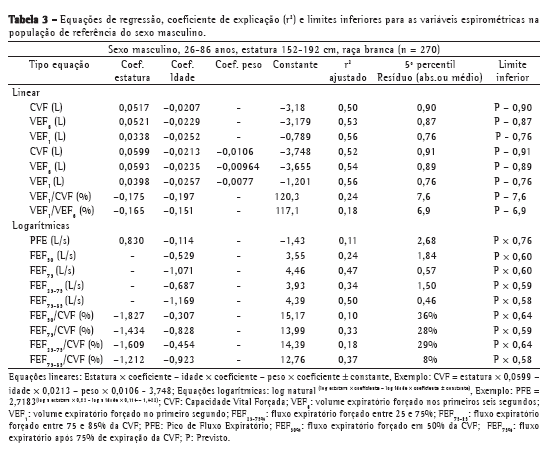 Os valores para os coeficientes de explicação (r2) foram, em geral, maiores no sexo feminino; os coeficientes de explicação foram maiores para a CVF e VEF1 em comparação aos obtidos para os fluxos expiratórios. Em relação à idade, o VEF1 cai em média 26 mL/ano no sexo masculino e 20 mL/ano no sexo feminino; os limites inferiores dos parâmetros de fluxo meso e tele-expiratórios e suas relações com a CVF situam-se em geral em torno de 50 a 60%; os fluxos tele-expiratórios, ou seja, fluxo expiratório forçado de 75% e fluxo expiratório forçado entre 75 e 85% exibem valores de r2 maiores em comparação aos fluxos derivados do meio da curva expiratória.