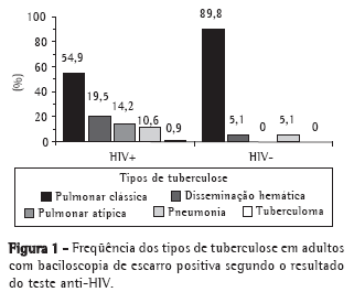 Considerando-se os tipos de TB, a distribuição foi diferente entre os pacientes HIV-positivos e os HIV-negativos (p < 0,001) (Figura 1). A TB pulmonar atípica ocorreu somente nos pacientes HIV-positivos, os quais também apresentavam freqüências maiores de TB de disseminação hemática e de pneumonia tuberculosa e, conseqüentemente, uma freqüência menor de TB pulmonar clássica. Não ocorreram casos dos tipos TB ganglionar mediastinal, TB pleural e TB com radiografia de tórax normal.