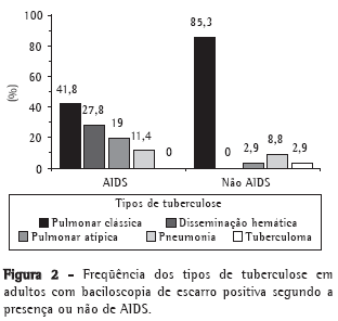 Neste estudo, a menor freqüência de TB pulmonar clássica observada entre os pacientes HIV-positivos em comparação aos HIV-negativos (54,9 vs. 89,8%), entre os pacientes HIV-positivos com e sem AIDS (41,8 vs. 85,3%) e entre os pacientes HIV-positivos com CD4 = 200 células/mm3 em comparação àqueles com valores maiores (26,7 vs. 70,4%) foi conseqüência do número elevado de casos de TB de disseminação hemática e de TB pulmonar atípica entre esses pacientes.