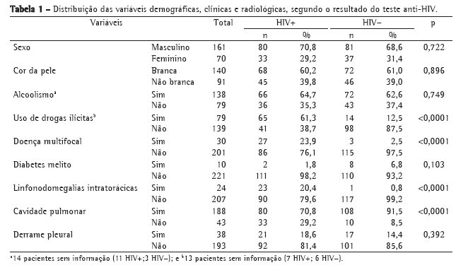Objetivo: Descrever as diferenças na apresentação clínico-radiológica da tuberculose segundo a presença ou não de infecção por HIV. Métodos: Examinou-se uma amostra consecutiva de 231 adultos com tuberculose pulmonar bacilífera internados em hospital de tisiologia. A presença de infecção por HIV, AIDS e fatores associados foi avaliada e as radiografias de tórax foram reinterpretadas. Resultados: Havia 113 pacientes HIV-positivos (49%). Estes pacientes apresentavam maior freqüência de tuberculose pulmonar atípica (lesões pulmonares associadas a linfonodomegalias intratorácicas), tuberculose de disseminação hemática e tuberculose pulmonar associada a linfonodomegalias