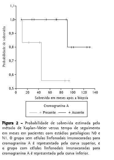 As curvas de sobrevida de Kaplan-Meier apresentadas na Figura 2 mostram que a sobrevida foi mais baixa entre os pacientes com células tumorais micrometastáticas coradas para cromogranina A do que entre aqueles sem tais micrometástases, sendo essa diferença de significância limítrofe (p = 0,05). Considerando-se a sobrevida em uma análise multivariada ajustada para idade, sexo, tipo histológico e reestadiamento, a taxa de sobrevida foi 7 vezes maior na ausência de micrometástases para pacientes abaixo de 57 anos com adenocarcinoma. Os riscos relativos para esses preditores são mostrados na Tabela 2.