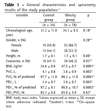 The general characteristics and the spirometry results of the two groups are shown in Table 1. There were no statistical differences between the two groups in terms of chronological age, gender, height, or ethnicity. The mean BMI was 24.6 ± 0.6 kg/m2 in the control group (range, 19.2-29.8 kg/m2 ) and 47.5 ± 0.7 kg/m2 in the study group (range, 40.0-65.6 kg/m2 ), the difference between the two groups being significant (p < 0.0001). Significant differences were found between the two groups in terms of FVC and FEV1 , in absolute values and in percentage of predicted. However, no significant difference was found in terms of the FEV1 /FVC ratio (p = 0.63).