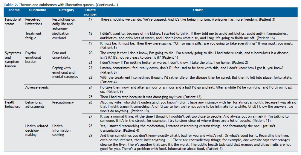 Functional status was widely recognized as an important outcome, with tuberculosis and its treatment significantly affecting physical abilities. Although the functional impact of tuberculosis sequelae is well documented,(23) the impact of active tuberculosis on daily living remains underrepresented in the literature. Participants highlighted the burden of symptoms on daily activities, contributing to psychological and physical distress. Despite these challenges, most remained adherent to treatment, recognizing its necessity. Providing adequate support and education on the impact of tuberculosis on daily function could enhance PROs.