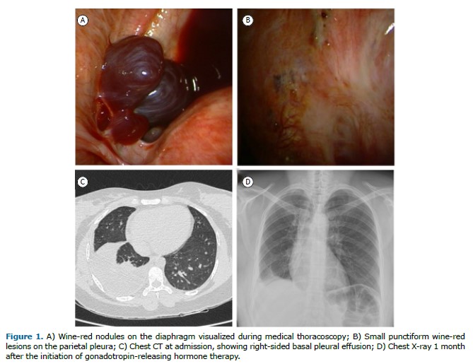 A 38-year-old Brazilian woman with a previous diagnosis of pelvic inflammatory disease presented to our hospital with a two-month history of dyspnea, chest pain, and dry cough. Chest CT revealed right-sided basal pleural effusion. The QuantiFERON-TB test result was positive. On the basis of those findings and the symptoms, we suspected a diagnosis of pleural tuberculosis. An explorative thoracentesis was performed. The aspirated pleural fluid was hemorrhagic. The cytological examination showed a predominance of histiocytes and leukocytes, and no malignant cells were detected. At that point, we decided to perform medical thoracoscopy to obtain biopsy specimens from the parietal pleura. The procedure revealed thickened pleura and small, wine-red lesions on the diaphragm and parietal pleura (Figure 1), findings suggestive of pleural endometriosis. Histopathological analysis confirmed the presence of epithelial glandular elements, and immunohistochemical staining was positive for CD10 and estrogen receptors. Thoracic endometriosis presents nonspecific symptoms, making the diagnosis challenging. In women of reproductive age presenting with chest pain and pleural effusion, endometriosis should be considered as a possible cause. (1) Hormone suppression therapy with gonadotropin-releasing hormone analogs can help alleviate symptoms as well as improving the overall quality of life and daily functioning. (2) Early recognition and multidisciplinary care are key to achieving better outcomes.(3)