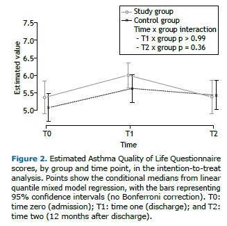 The following data and assessments were recorded or performed at admission, designated time zero (T0): demographics; anthropometrics; asthma severity according to the GINA guidelines(9); comorbidities, assessed with the Cumulative Illness Rating Scale Severity and Comorbidity Index(19); the Asthma Control Test score(17); steroid use and number of exacerbations in the previous 12 months; dynamic lung volumes according to standards(20) using the predicted values established by Quanjer et al.(21); arterial blood gases; and airway inflammation, identified by measuring the fractional exhaled nitric oxide (FeNO).(22) At discharge (T1), we also applied the Global Perceived Effect scale.(23)
