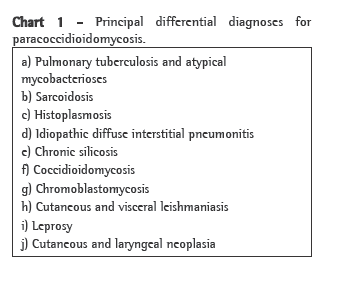 The principal differential diagnosis is pulmonary tuberculosis, which is quite similar to paracoccidioidomycosis with regard to the radiological alterations and clinical manifestations (Chart 1). The diagnosis is confirmed by the presence of the fungus (paracoccidioidomycosis) or of Koch's bacillus (tuberculosis) in the specimens analyzed. Tuberculosis and paracoccidioidomycosis can affect the same individual, and this association occurs in 5.5-19% of the cases, which makes the diagnosis of the two diseases more difficult.(4,6)
