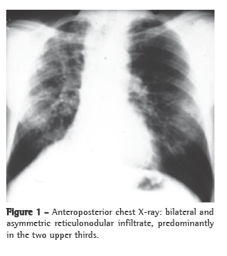 A simple chest X-ray (Figure 1) can reveal asymmetric reticulonodular infiltrate, predominantly in the two upper thirds of both lungs, accompanied by hypertransparent areas at the lung bases.(1,2,4)