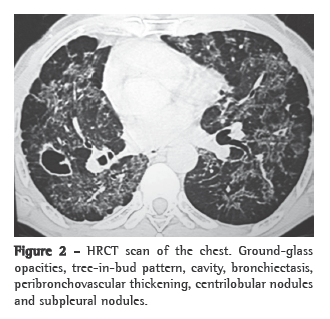 A HRCT scan (Figure 2) can reveal nodules, ground-glass opacities, tree-in-bud pattern, acinar lesions, parenchymal bands, peribronchovascular interstitial thickening, cavities, reticular pattern, "reversed halo" sign, scar-related emphysema and traction bronchiectasis.(8,9)